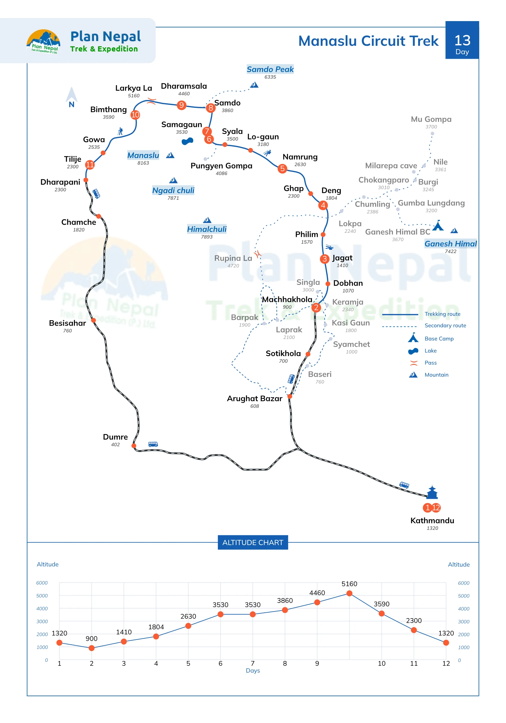 On average, you will spend 6 to 8 hours per day trekking, depending on the terrain, altitude, and specific segment of the route. Some shorter days (like acclimatization hikes) may only take 3–4 hours, while tougher days like crossing Larkya La Pass can require 8–10 hours of walking. Our expert guides from Plan Nepal Trek & Expedition always ensure the pacing suits your fitness level and acclimatization needs.